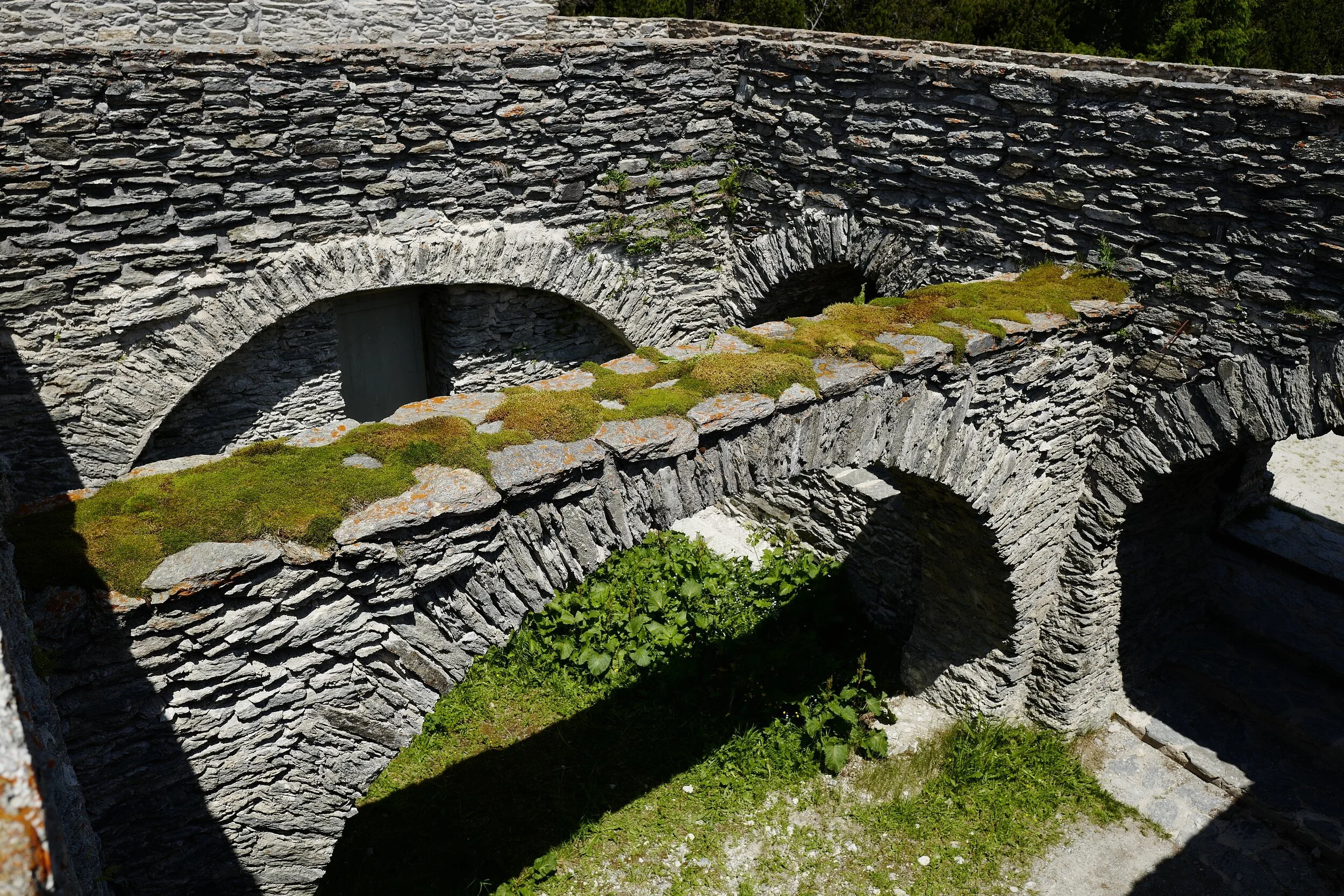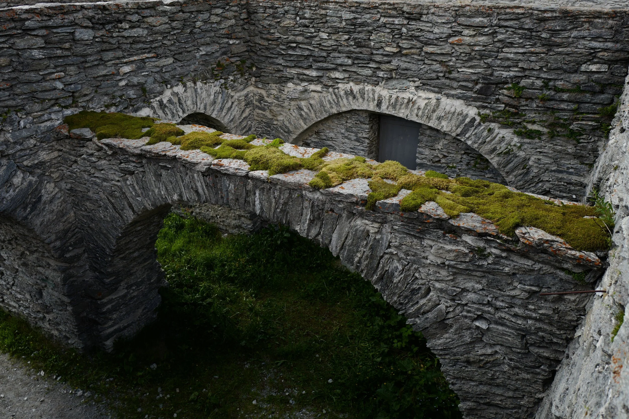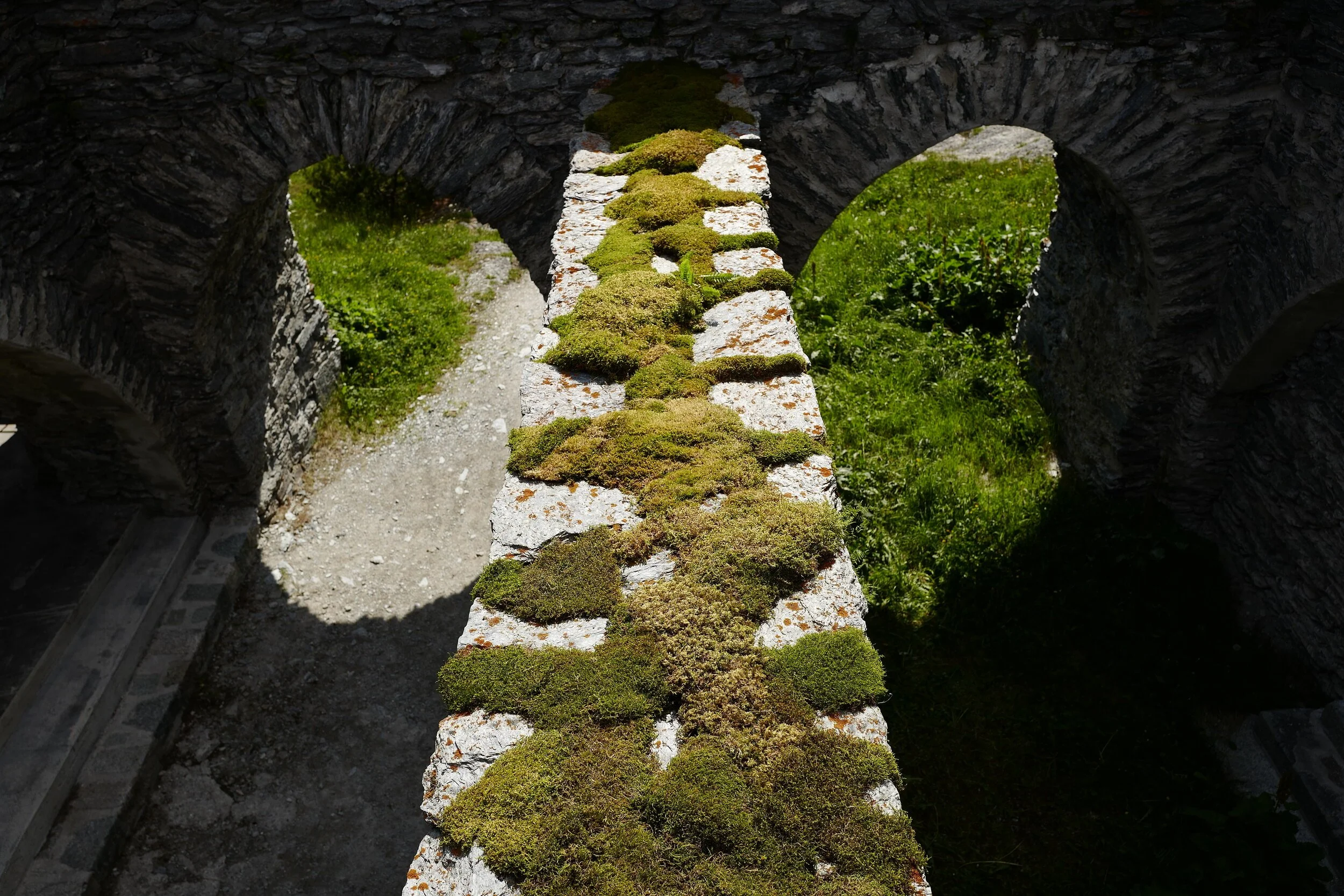 Im Sommer 2017 realisierte ich in Maloja im Rahmen der Naturkunst al Castel, eine Moos–Installation in den Ruinen des Torre Belvedere. Auf dem Torbogen des ehemaligen Ballsaals, belegte ich die Beton–und Zementstellen mit verschiedenen Moosen.